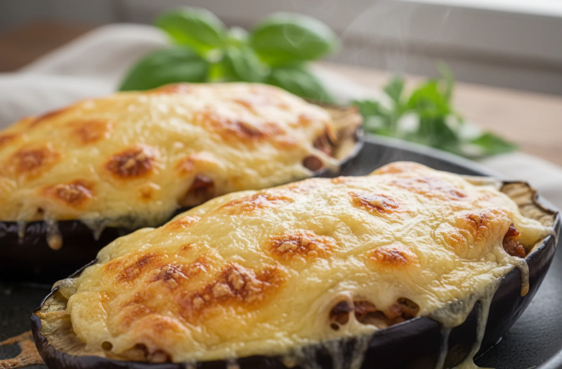 Rellenamos las medias berenjenas con nuestra mezcla de berenjena, pechuga de pollo, setas y cebolla. Con una cuchara espolvoreamos el queso rallado encima de cada una de ellas. Después preparamos una placa de horno con papel de hornear, ponemos las berenjenas encima y las metemos al horno durante 15 minutos. ¡Y listo para servir y degustar nuestras berenjenas! Si lo prefieres, puedes emplatar las berenjenas espolvoreando un poco de perejil picado.