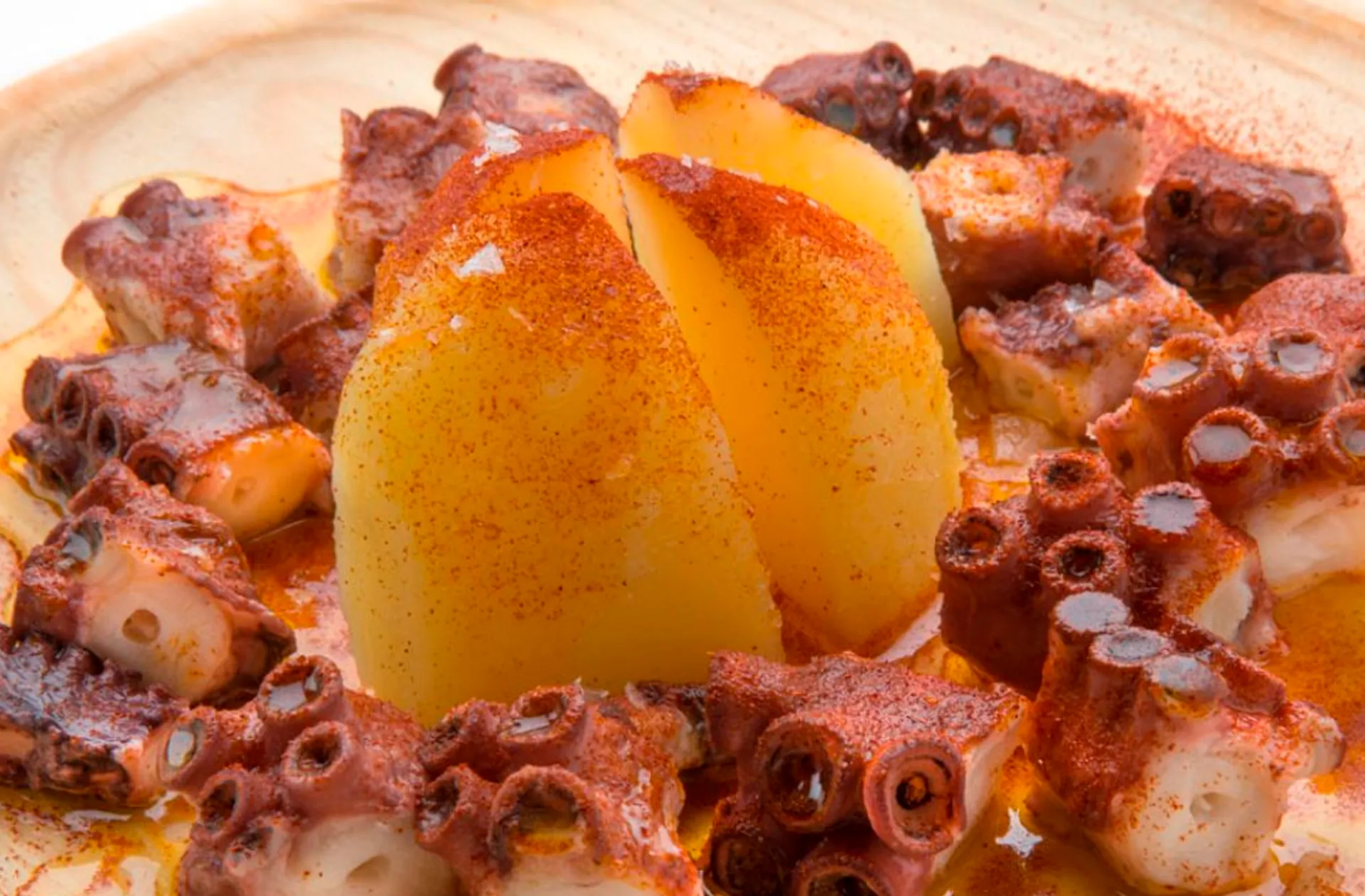 Untamos el fondo de una fuente con la mezcla de ajo machacado y, colocamos encima las patatas. Aderezamos con sal gorda y ponemos encima el calamar. Lo regamos todo con un chorro de aceite y espolvoreamos con el pimentón picante. Ponemos el broche final a nuestro plato decorándolo con una ramita de perejil y, ¡listo para servir a tus invitados!.