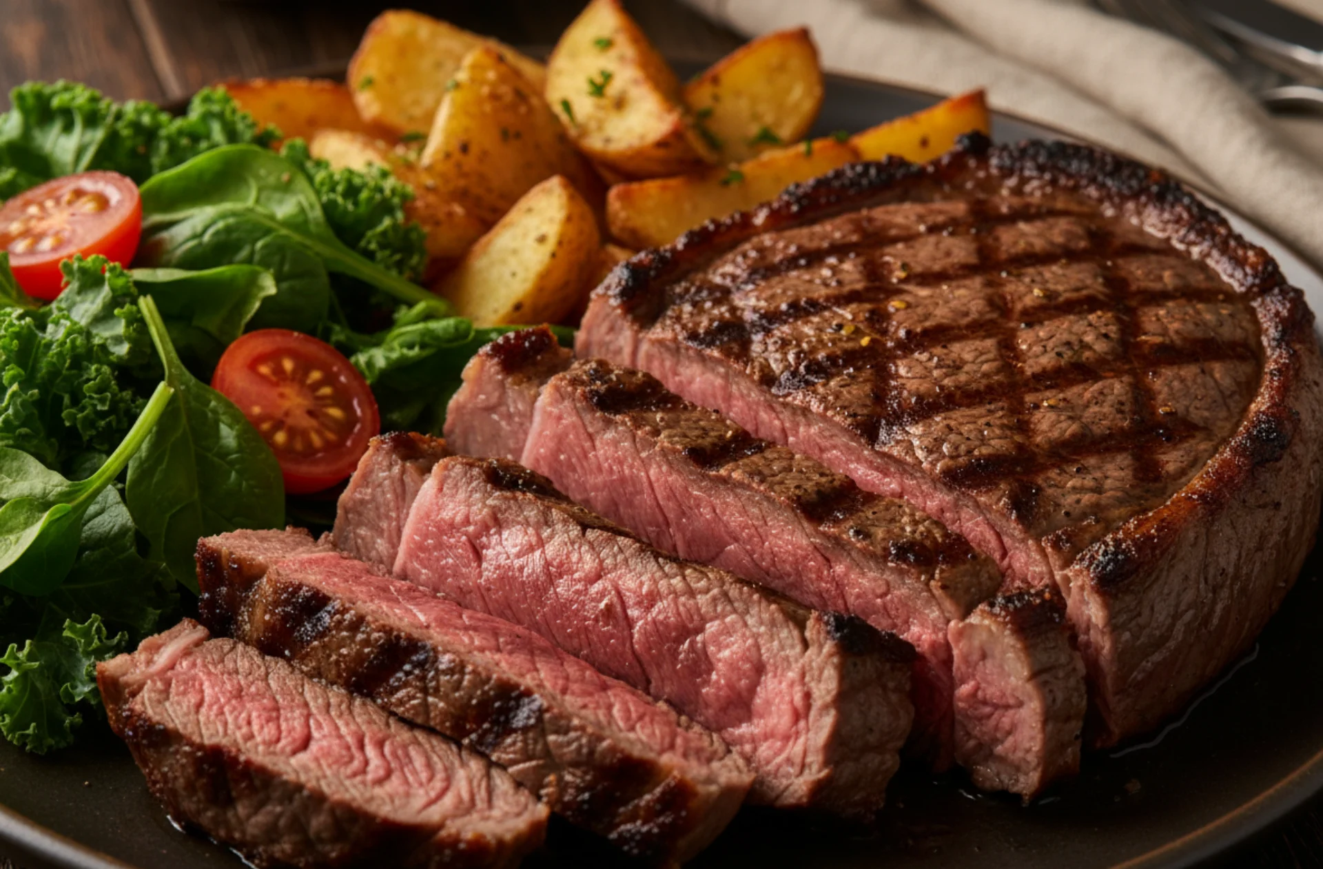 Por otra parte, vamos a cocinar chuletón al fuego de la barbacoa y, cuando esté listo, lo retiramos y la sazonamos. Servimos la carne junto con las patatas fritas y los pimientos, decoramos con una hoja de perejil y ¡listo para servir nuestro apetitoso plato de barbacoa!.