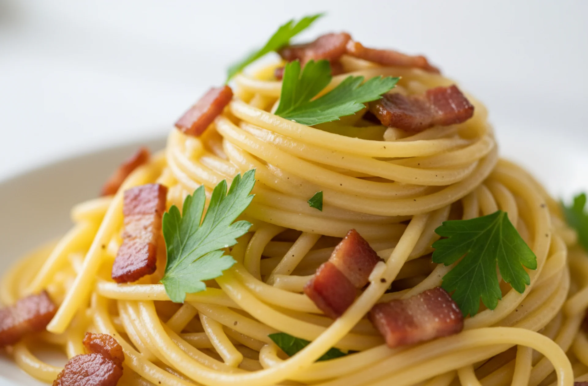 Para terminar, cuando la pasta esté lista, la retiramos, escurrimos y la servimos en el plato con la salsa por encima. Espolvoreamos un poco de perejil picado y ponemos dos o tres rollitos de jamón. Y… ¡Listo para servir!.