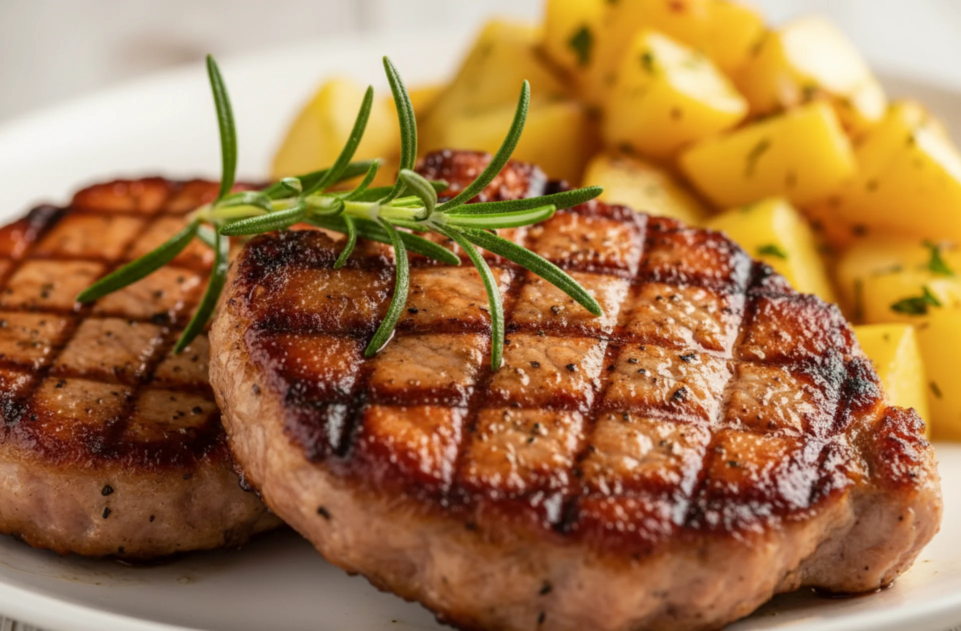 Coloca 4 chuletas de cerdo sobre una fuente para untarlas con un poco de aceite de oliva. Salpimiéntalas, añade el zumo de medio limón, media cucharadita de romero, tomillo, perejil y de ajo granulado. Cuando lo tengas, tápalas con papel film deja que marinen unos 30 minutos en el frigorífico.